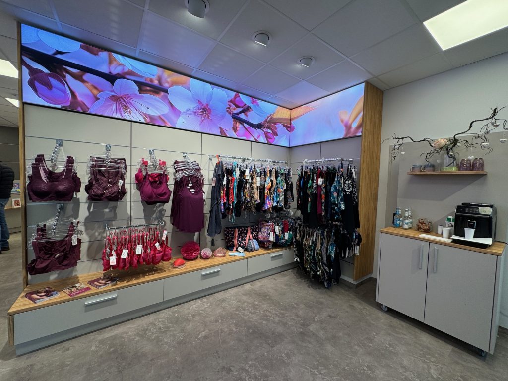 Anproberaum mit Wandarbeitsplatz und Schubladenregalwand